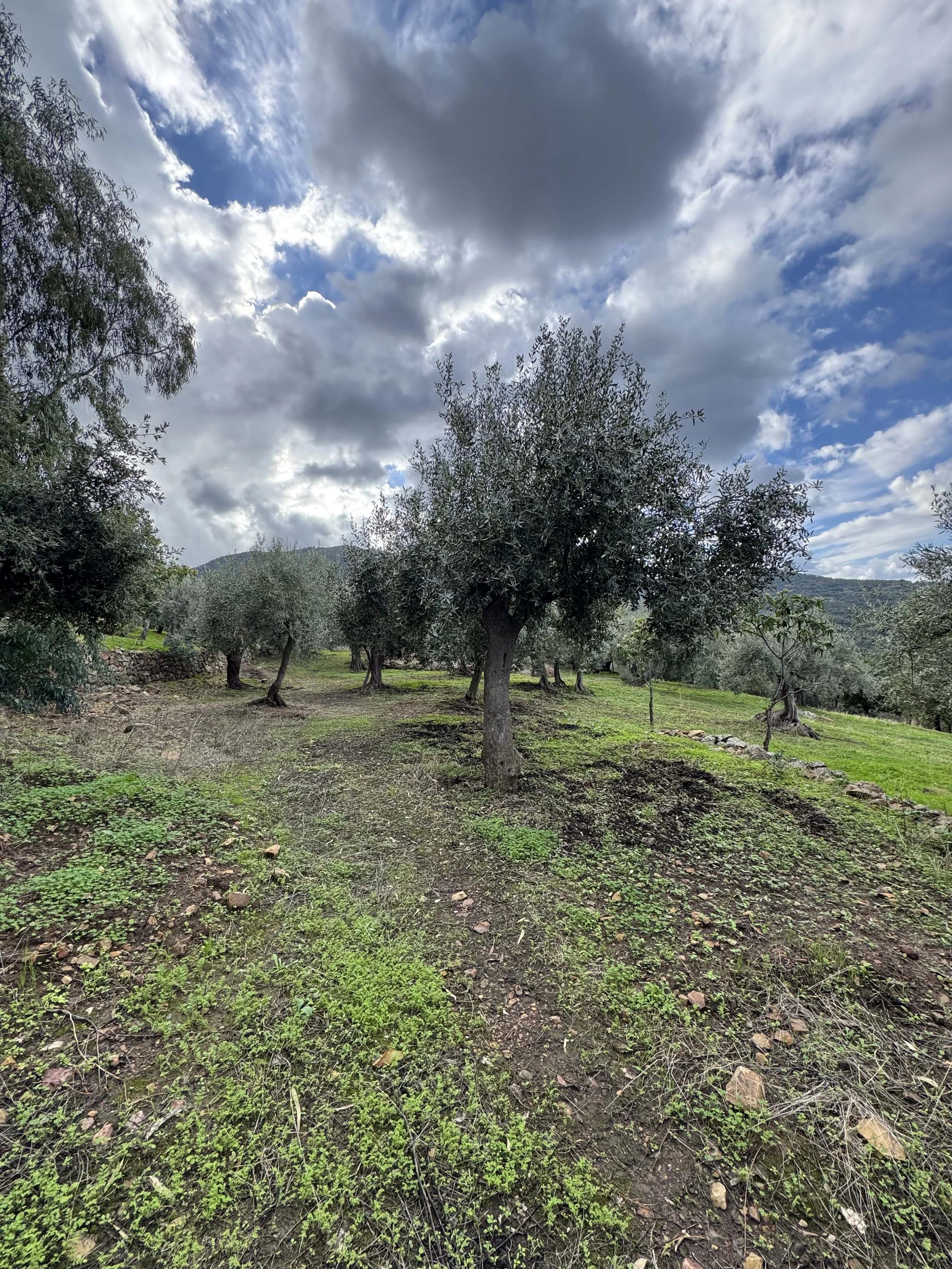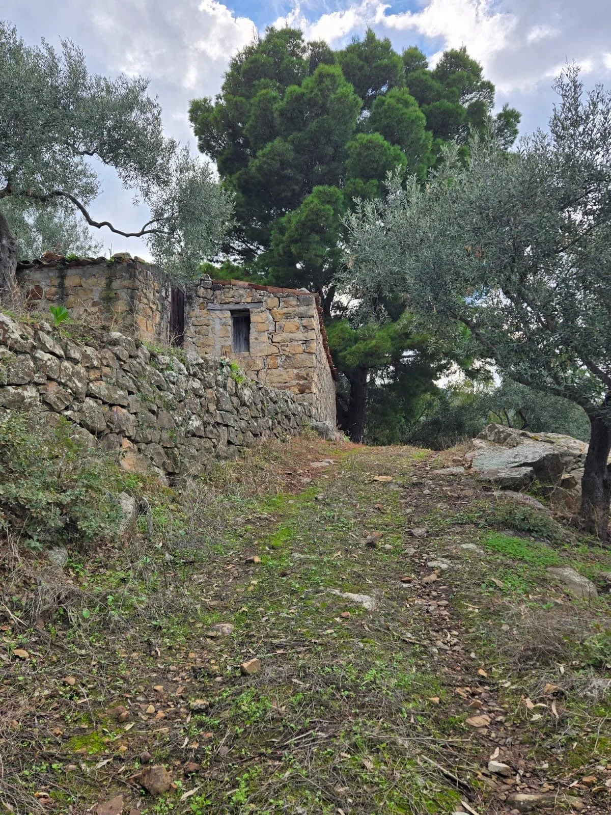 Olive trees on a hillside with a dirt path, scattered rocks, and a partly cloudy sky.