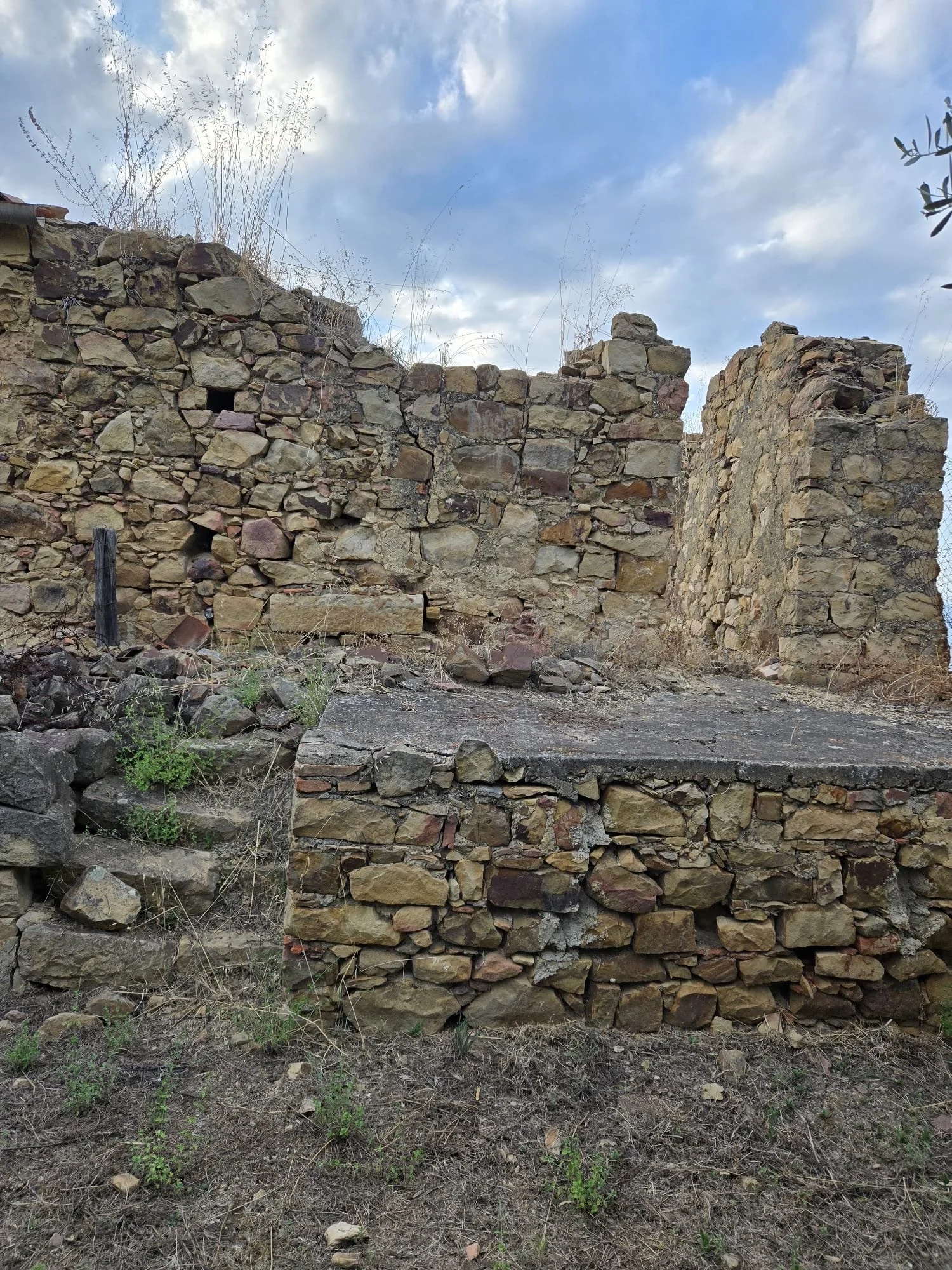 Ruins of an old stone structure with a partially collapsed wall and steps, surrounded by dry grass and plants under a cloudy sky.