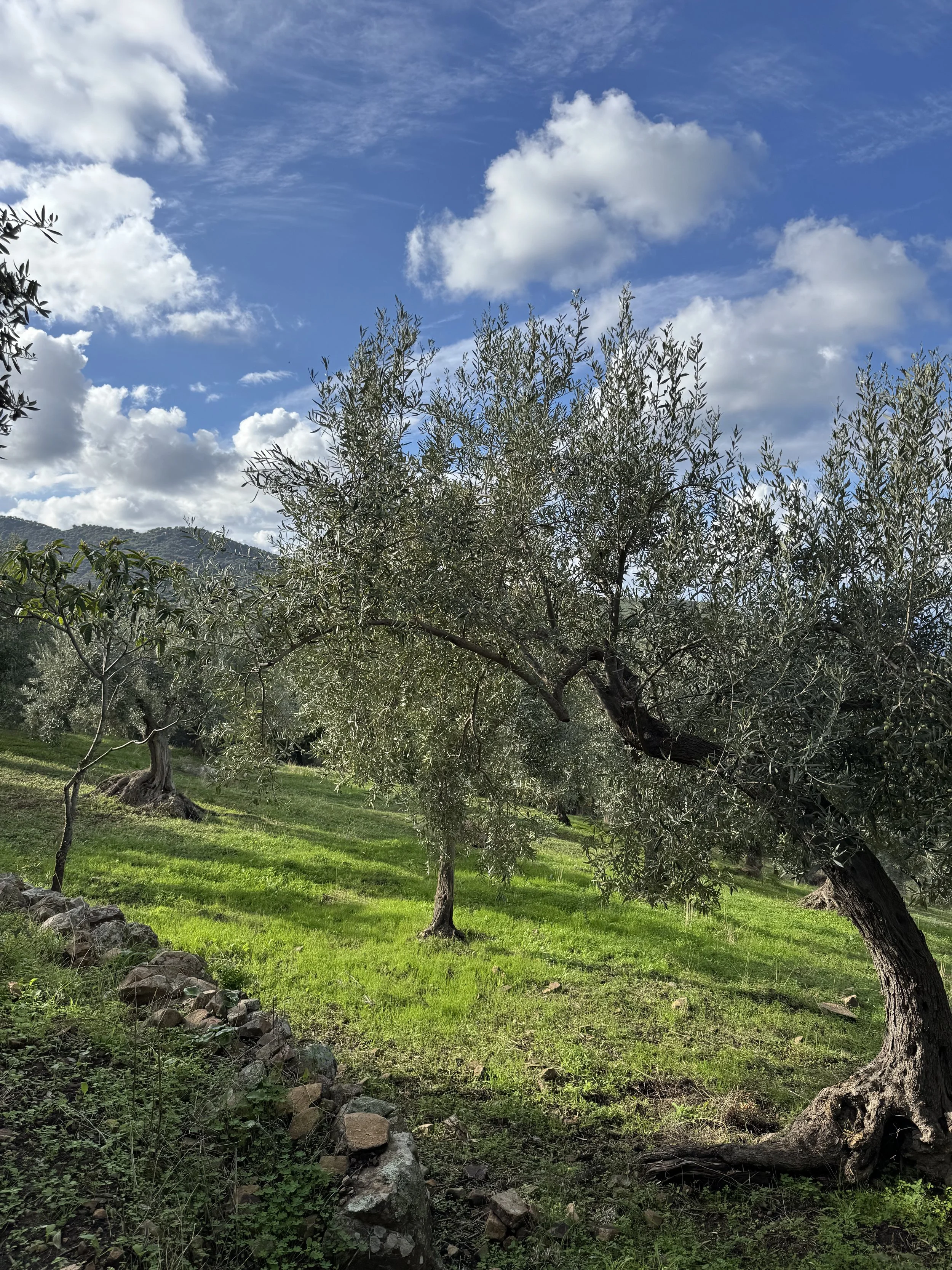 Olive trees on a hillside during daylight with a blue sky and scattered clouds, and sunlight filtering through the trees.