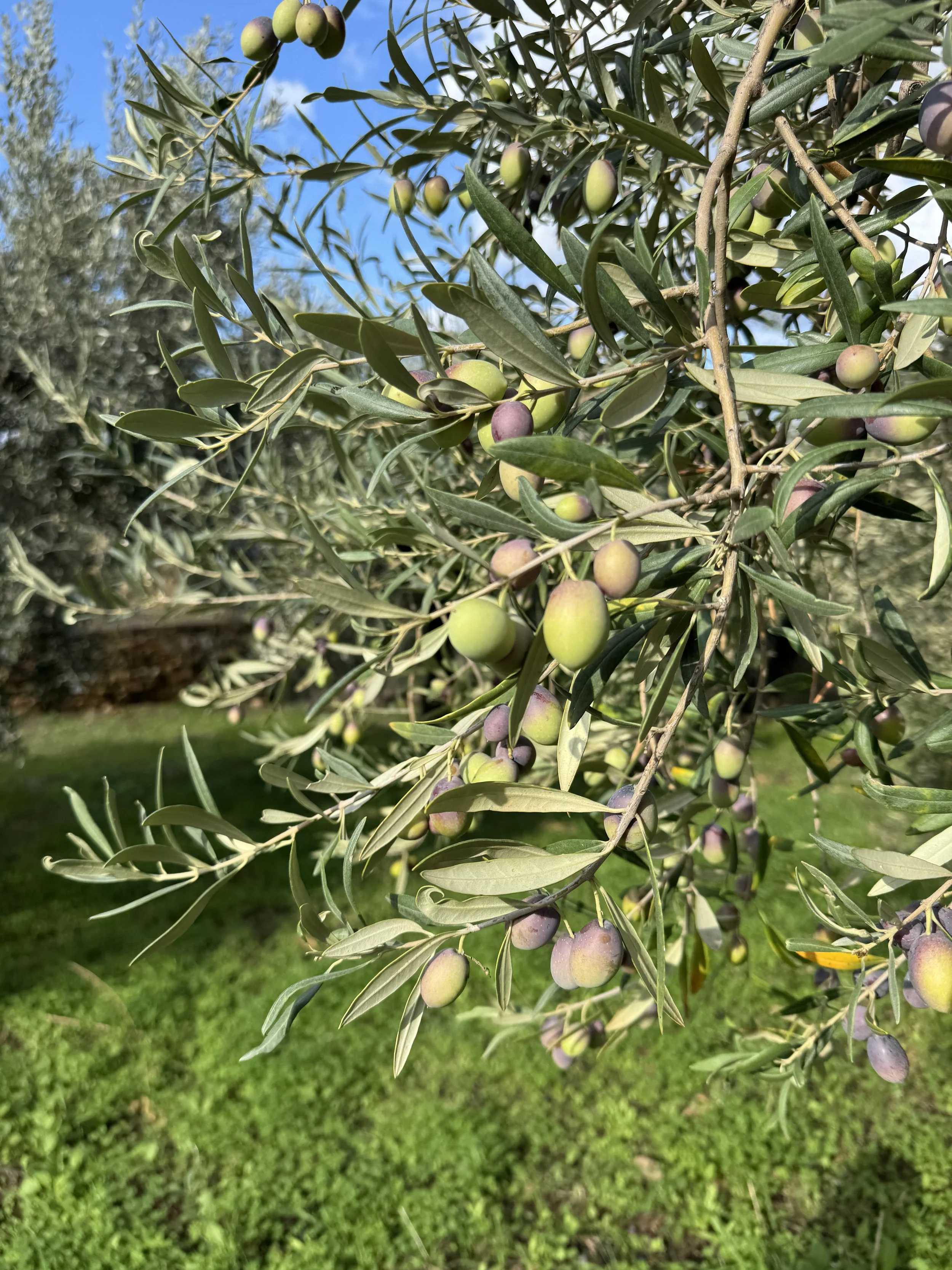 A hillside olive grove with small trees, grass, and a stone wall under a partly cloudy blue sky.