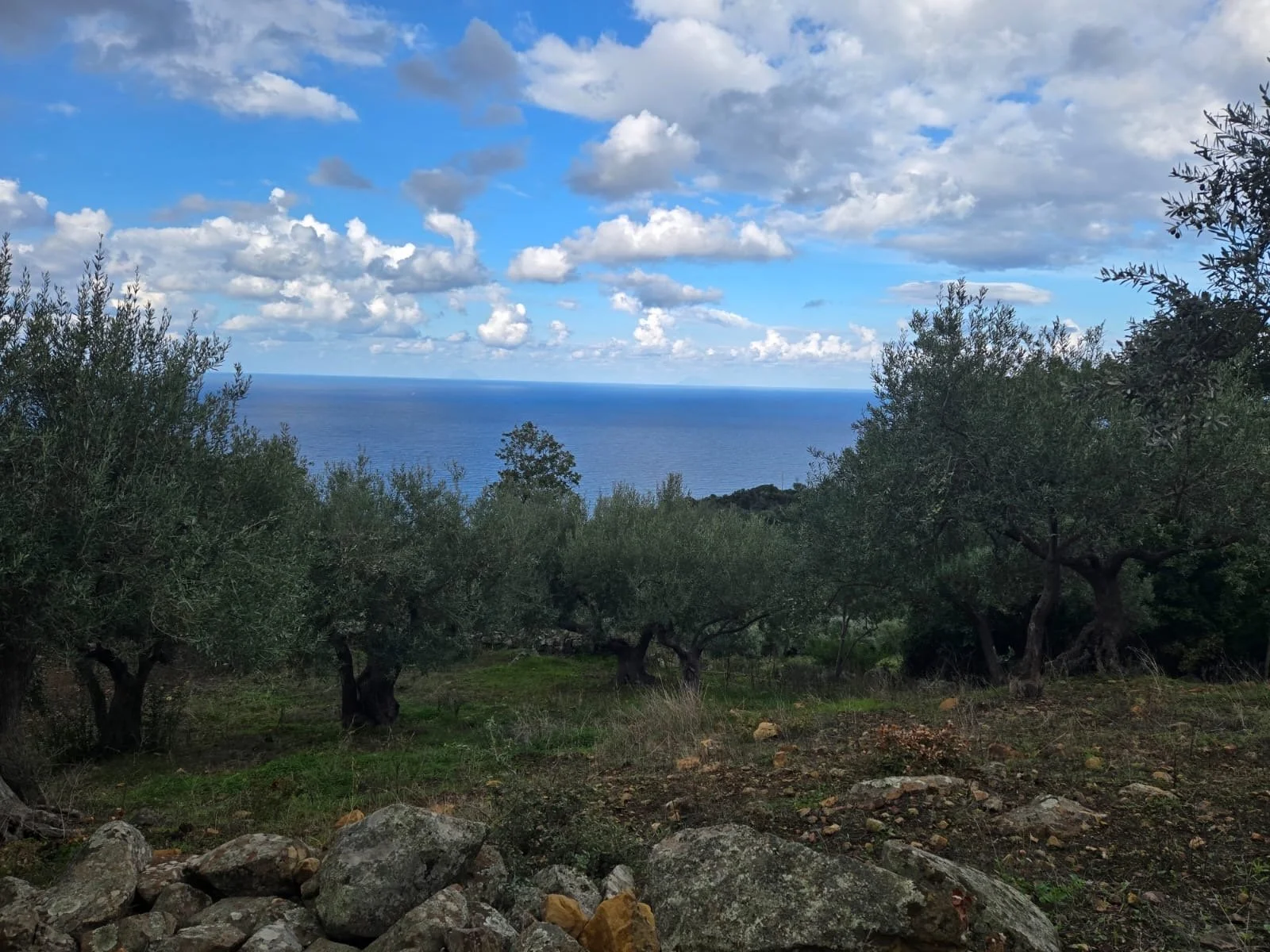 Olive trees on a grassy hillside with rocks in the foreground, overlooking the ocean under a partly cloudy sky.